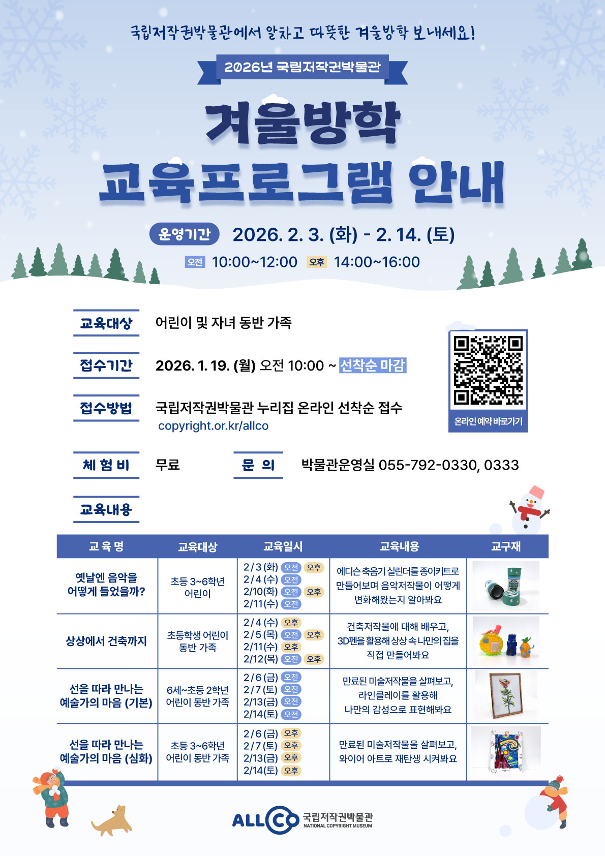 [2026년 국립저작권박물관 겨울방학 교육프로그램] 국립저작권박물관에서는 겨울방학을 맞이하여 어린이 및 어린이 동반 가족을 대상으로 한 다양한 체험프로그램을 운영합니다. 관심 있는 분들의 많은 참여 바랍니다. 🪄 겨울방학 교육프로그램 4종 안내  ① 방학교육 프로그램 <옛날엔 음악을 어떻게 들었을까?> - - 운영일시 : 매주 화요일 오전, 오후 / 수요일 오전 [총 6회]