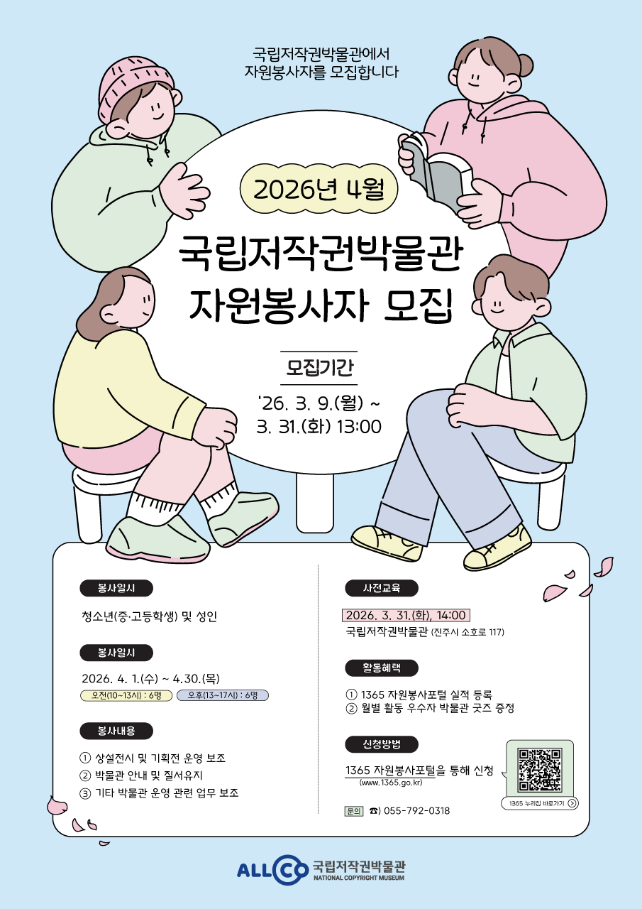 | 제 목 | 2026년 4월 국립저작권박물관 자원봉사자 모집 | 작성자 | 국립저작권박물관 | |||||||||