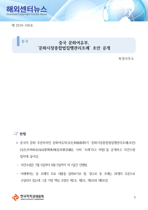 제2019-100호 중국[중국 문화여유부, ‘문화시장종합법집행관리조례’ 초안 공개].pdf